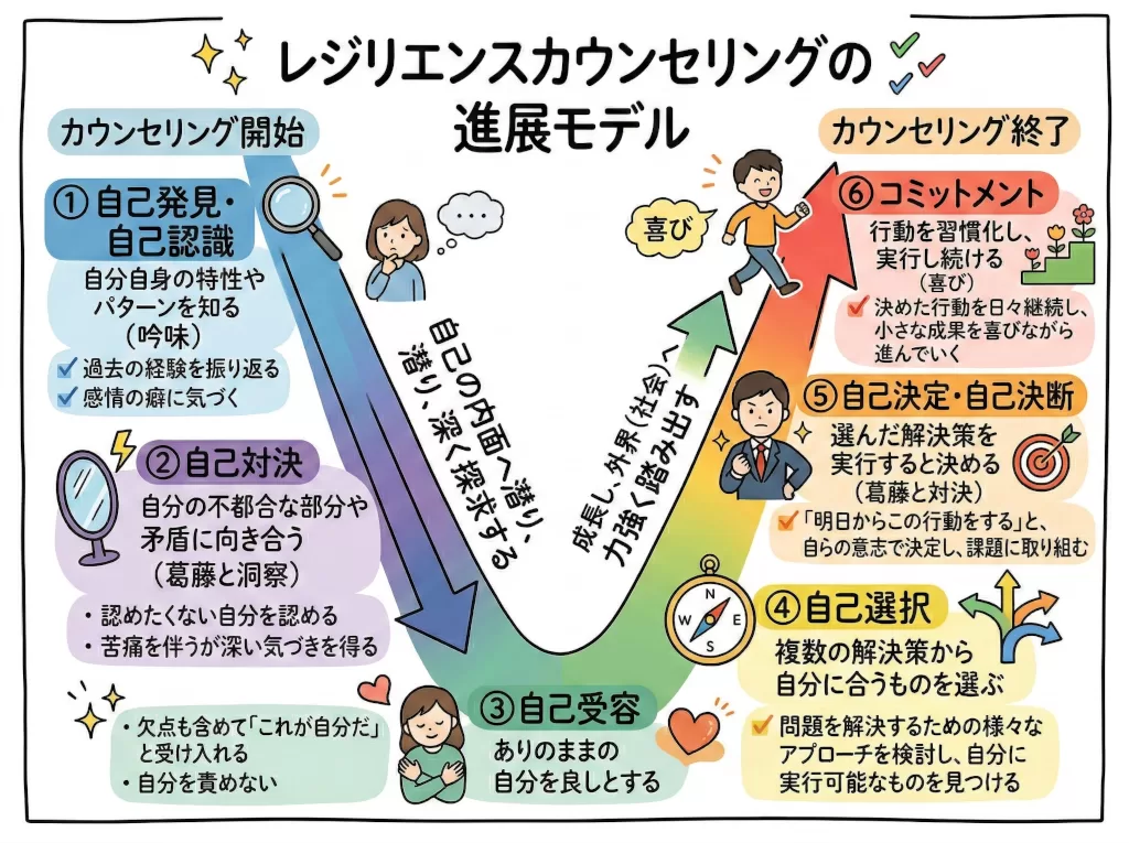 | レジリエンスに関わる要素 | ・プラス要因:自己効力感、社会的支援、ポジティブ感情、心理的安全性・マイナス要因:過度のストレス、不安、孤立など |
