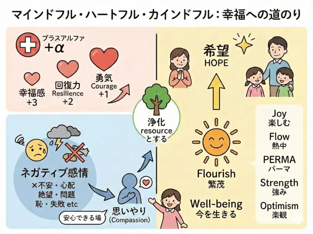 「マインドフル・ハートフル・カインドフル」 という三つの態度は、このすべてのプロセスを貫く基本姿勢であり、ネガティブ感情と向き合うときも、ポジティブ要素を育てるときも、希望を見出すときも、繁茂の状態を維持するときも、常に必要とされる心の在り方なのです。